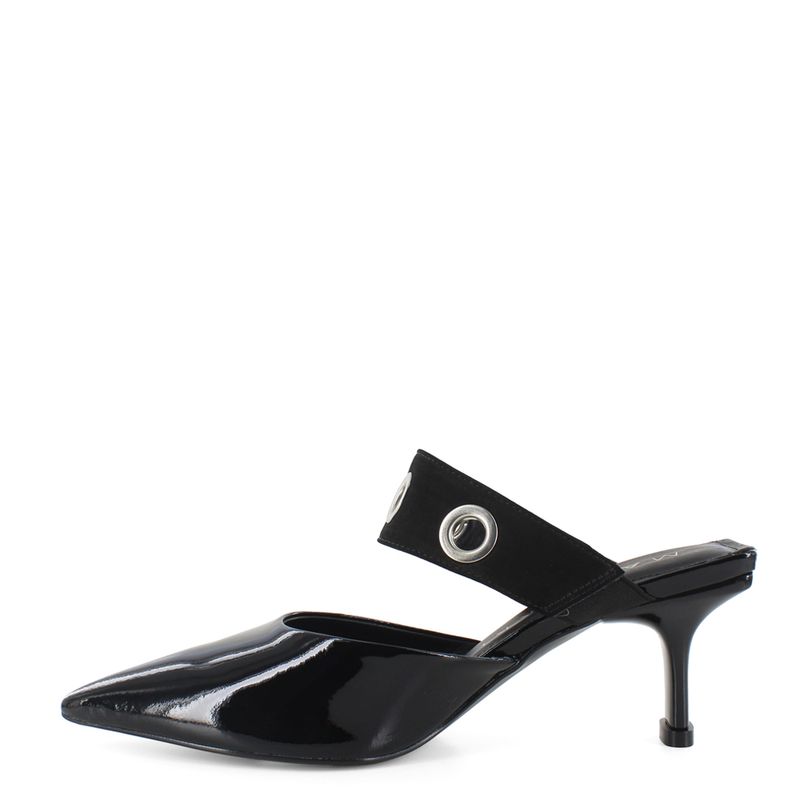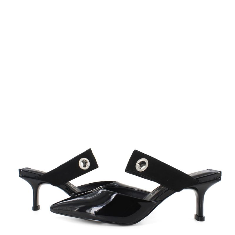Luce sofisticada y sin esfuerzo con este elegante calzado en charol, perfecto para elevar cualquier look. Su diseño destalonado con punta fina estiliza la silueta, mientras que los aros metálicos decorativos aportan un toque moderno y vanguardista. El tacón medio brinda altura y comodidad, ideal para llevar desde la oficina hasta una salida casual con estilo.