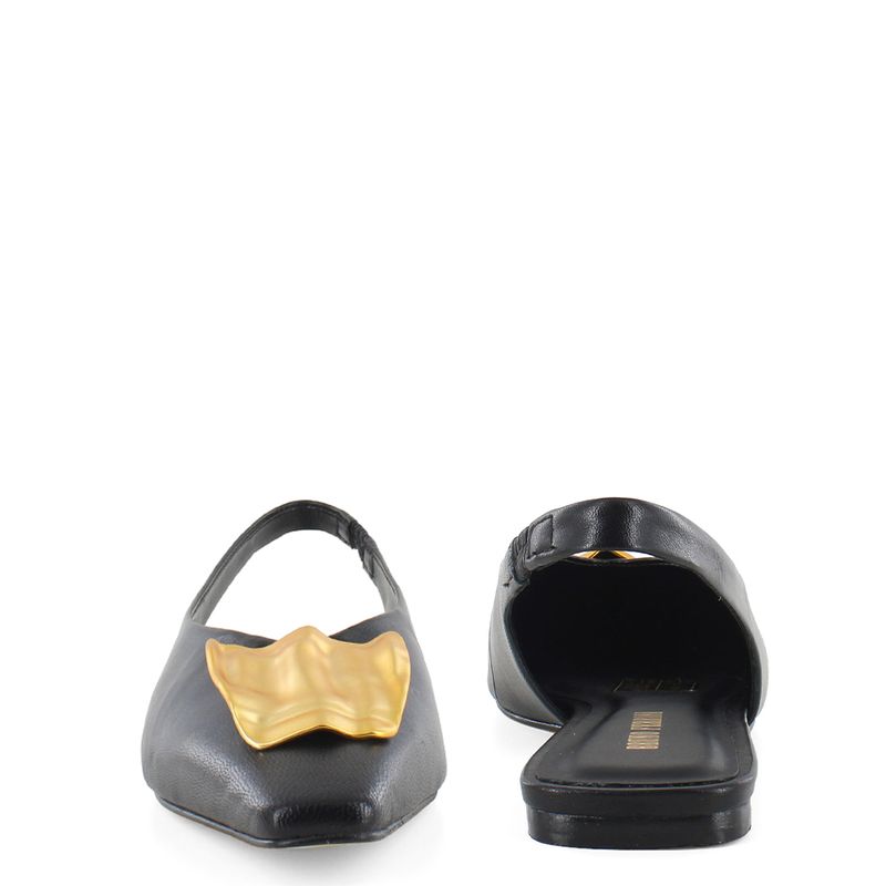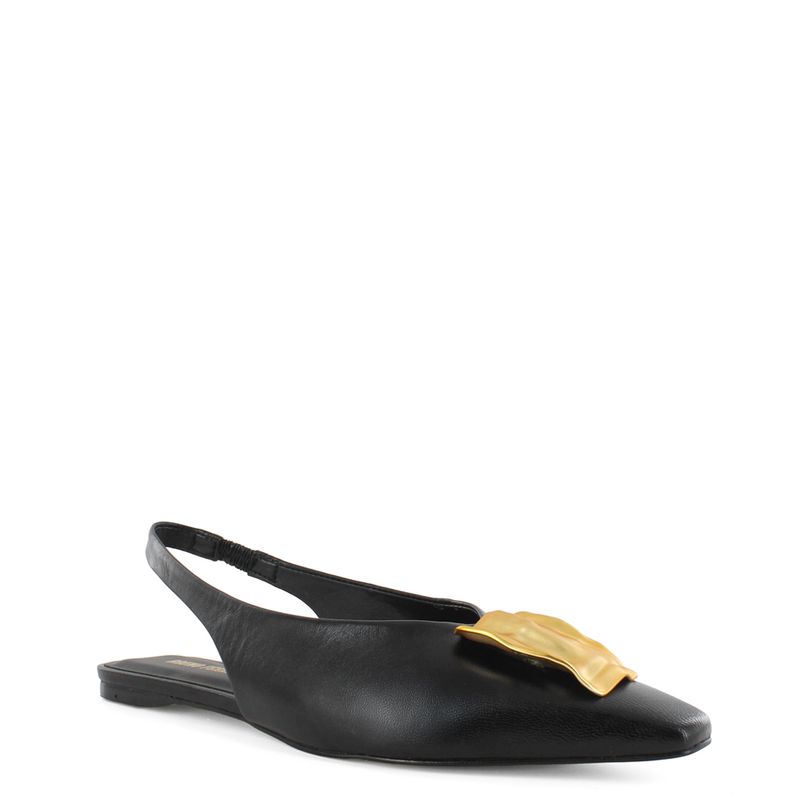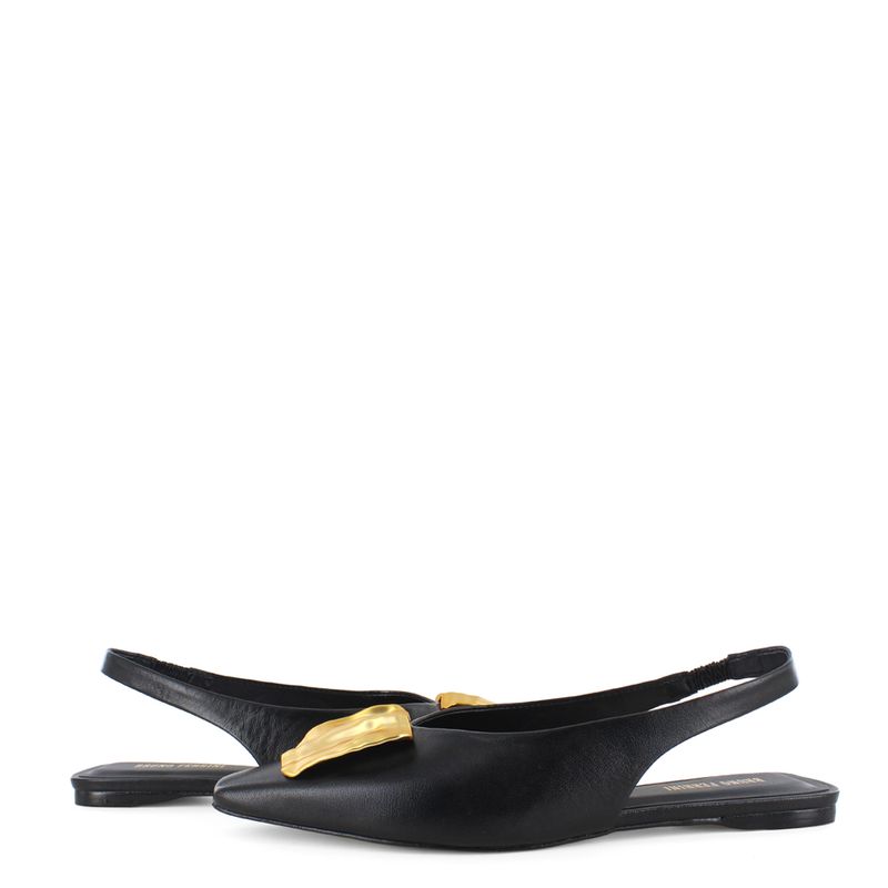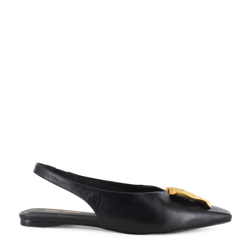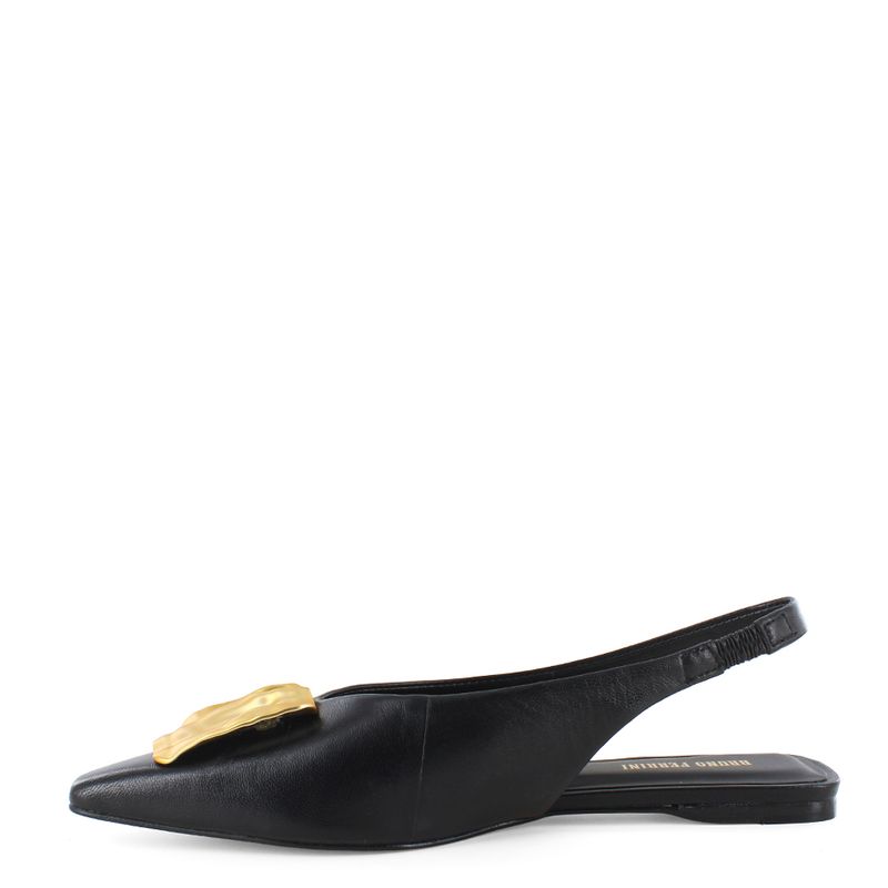 Su punta afilada y silueta limpia se complementan con un maxi aplique metálico dorado que añade un punto focal de lujo discreto. La tira elástica trasera garantiza que el zapato se mantenga en su lugar sin sacrificar la comodidad. Un básico imprescindible que funciona con todo, desde pantalones de vestir hasta vestidos casuales. Bruno Ferrini, lo mejor a tus pies