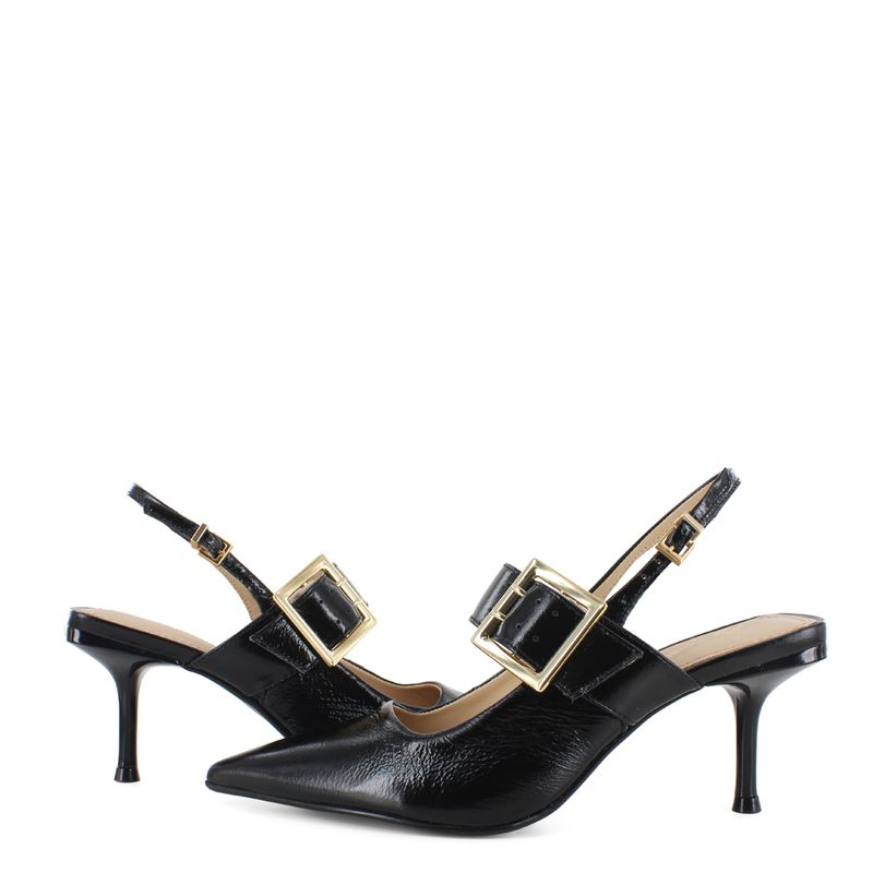 La estrella del zapato es la hebilla cuadrada oversize en tono dorado, que actúa como una joya sobre el empeine. El tacón kitten heel estilizado ofrece la elevación perfecta sin sacrificar la comodidad. Con una tira slingback ajustable, es ideal para llevar de la oficina a un evento nocturno con total sofisticación. Bruno Ferrini lo mejor a tus pies.