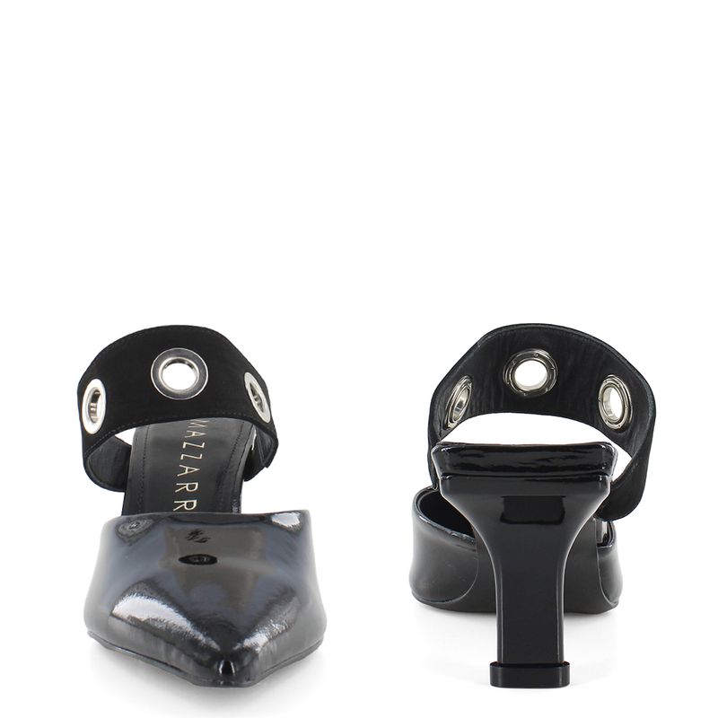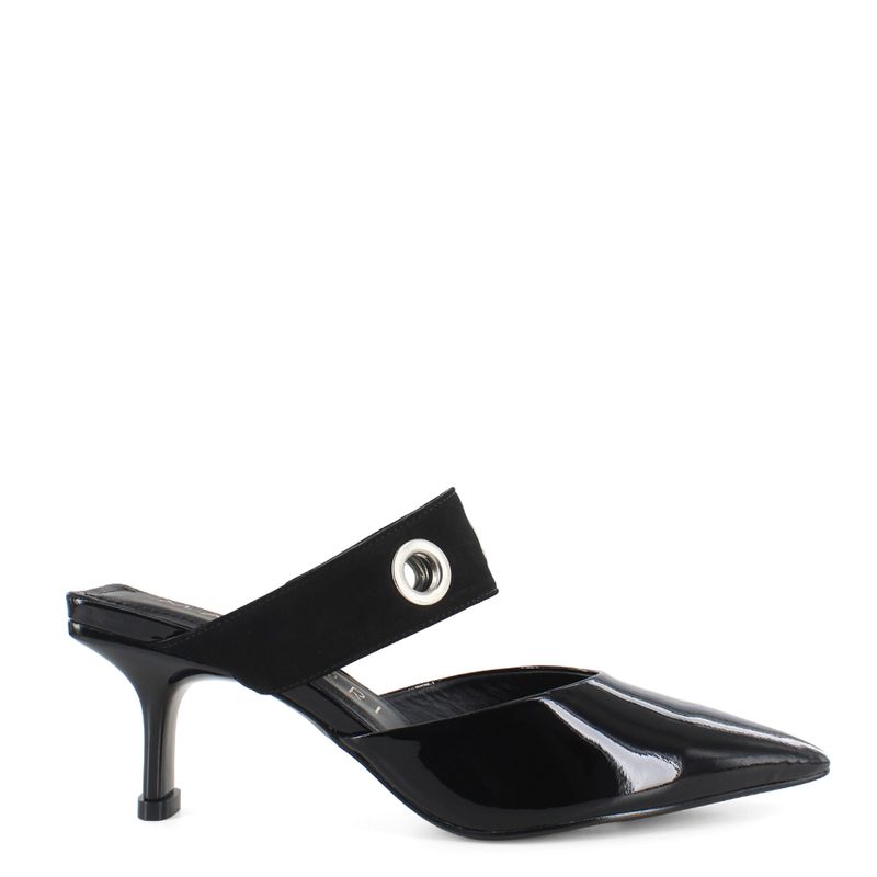 Luce sofisticada y sin esfuerzo con este elegante calzado en charol, perfecto para elevar cualquier look. Su diseño destalonado con punta fina estiliza la silueta, mientras que los aros metálicos decorativos aportan un toque moderno y vanguardista. El tacón medio brinda altura y comodidad, ideal para llevar desde la oficina hasta una salida casual con estilo.